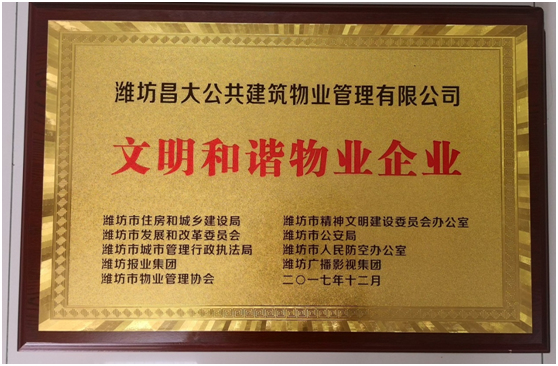 濰坊昌大公共物業(yè)管理有限公司獲“文明和諧物業(yè)企業(yè)”稱(chēng)號(hào)