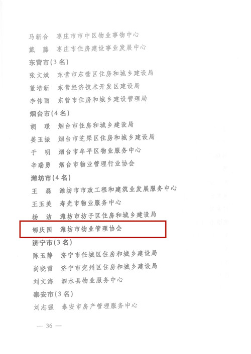 2019年,山東省住房和城鄉(xiāng)建設(shè)廳開(kāi)展了物業(yè)服務(wù)行業(yè)文明創(chuàng)建“標(biāo)準(zhǔn)建設(shè)年”活動(dòng),為表?yè)P(yáng)鼓勵(lì)先進(jìn),發(fā)揮示范引領(lǐng)作用,激發(fā)創(chuàng)建工作熱情,經(jīng)逐級(jí)申報(bào)、審核、公示等程序,公管公司獲得以下省級(jí)榮譽(yù):濰坊昌大公共建筑物業(yè)管理有限公司榮獲“全省物業(yè)服務(wù)行業(yè)文明創(chuàng)建標(biāo)兵企業(yè)”榮譽(yù)稱號(hào);總經(jīng)理郇慶國(guó)兼濰坊市物業(yè)協(xié)會(huì)會(huì)長(zhǎng)榮 ......
