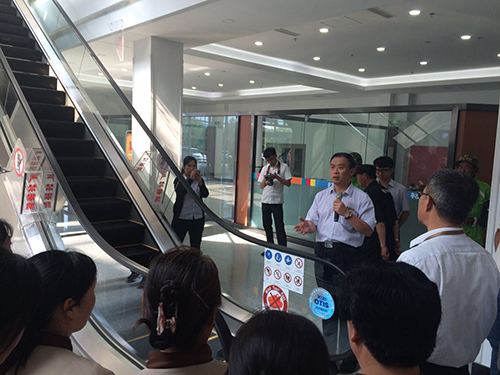 當天下午2:50,維保人員發(fā)出火警報警信號。各演練工作組在聽到指令后,迅速到位,在最短的時間內,于房間內、樓梯間及安全出口處,通過口令加手勢,指揮員工及群眾從指定路線進行有秩序地疏散,把現(xiàn)場所有人員,快捷有序地疏散到安全地帶。